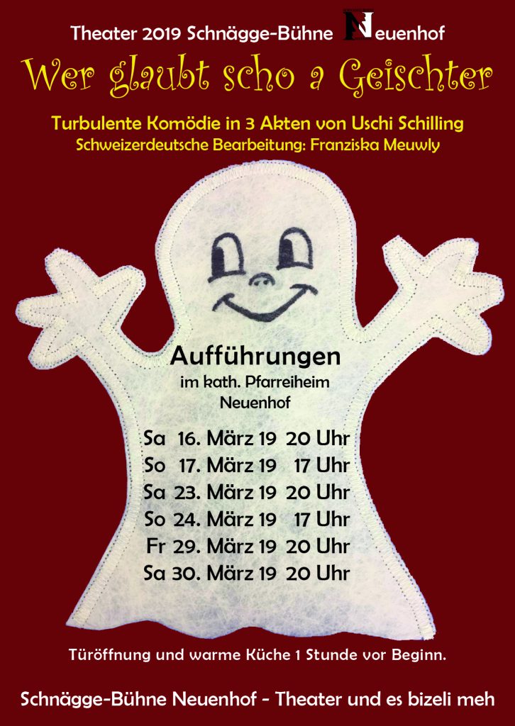 Noiehof – Au i de Johr hed d Schnägge-Bühni Neuehof es Theaterstück iistudiert. Ufgfüehrt wird: Wer glaubt scho a Geister.