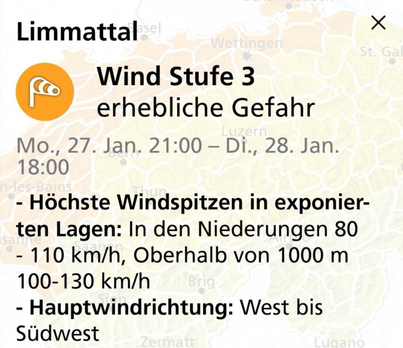 Mit Windspitze bis 110km/h in de Niderige binere Hauptwindrichtig vo Wescht bis Südwescht. Das teild Meteo Schwiiz mit. Vom 27. Januar 2020 um Nüni am Abig, bis Tsichtig, 28. Januar 2020 um di Sächsi am Abig bestoht Gfahrestuef 3, was «erheblichi Gfahr» bedüted.