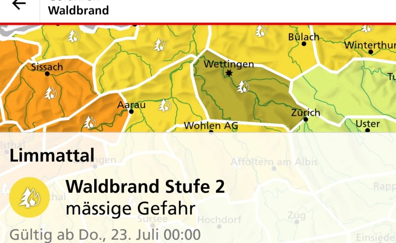 Während in andere Kantön d Waldbrandgfahr teilwiis scho es Zitli uf Stuefe 3 isch, hat de Aargau bis geschter no d Stuefe 1 gha, also kei Gfahr. Im Blick uf d Trocheheit und de 1. August, wo durch d Höhefüür und Füürwerch s Risiko vo Waldbrand stiigd, het de Kanton am 23. Juli d Gfahr uf d Stuefe 2 erhöht. Es Verbot vo Füürwerch isch das no ned, aber zeiged, dass s Risiko ned set unterschätzt werde.