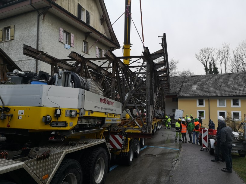 abtransportiert worde, wil si saniert wird. Miteme Pneukran isch si in Milimeterarbet useglüpft und uf en Spezialtransporter glade worde.