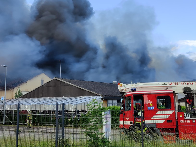 Im Industriegebiet z Spreitebach isch en Grossbrand usbroche. Siebe Persone hend e Rauchgasvergiftig becho.