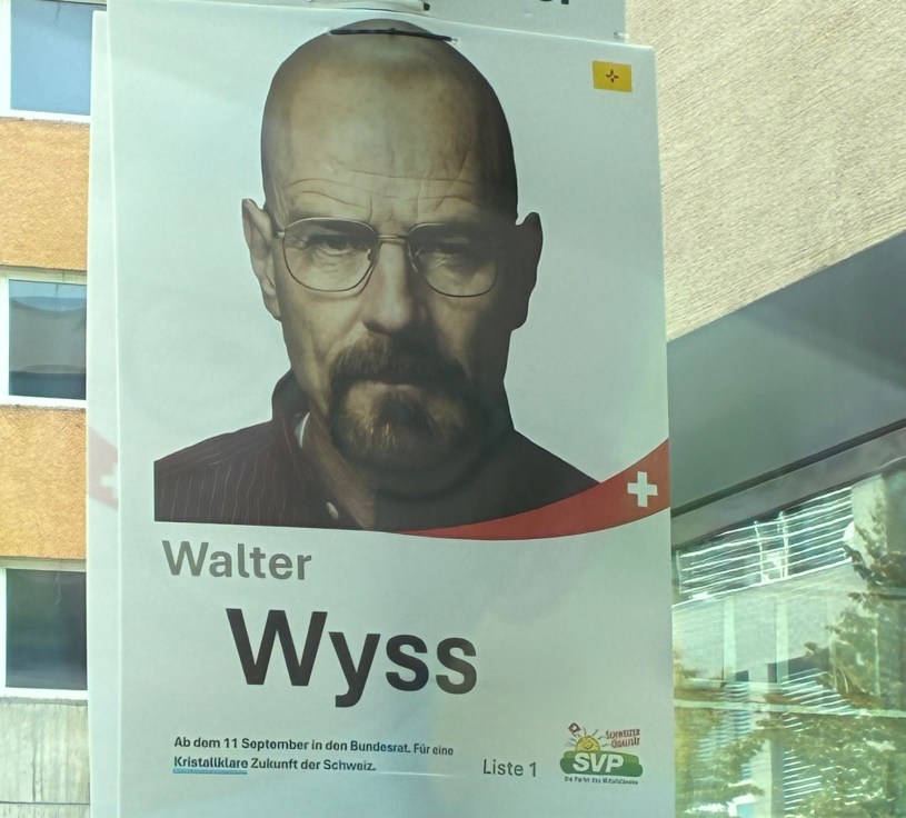 Für Fans vo de Serie «Breaking Bad» erschlisst sich schnell, das das Plakat mit em Walter Wyss voll vo Aaspilige uf di Serie isch. «Kristallklari Zuekunft» heissts da au no, was en Aaspilig uf das reine Methamphetamin isch, wo numme de Walter White so perfekt cha herstelle.